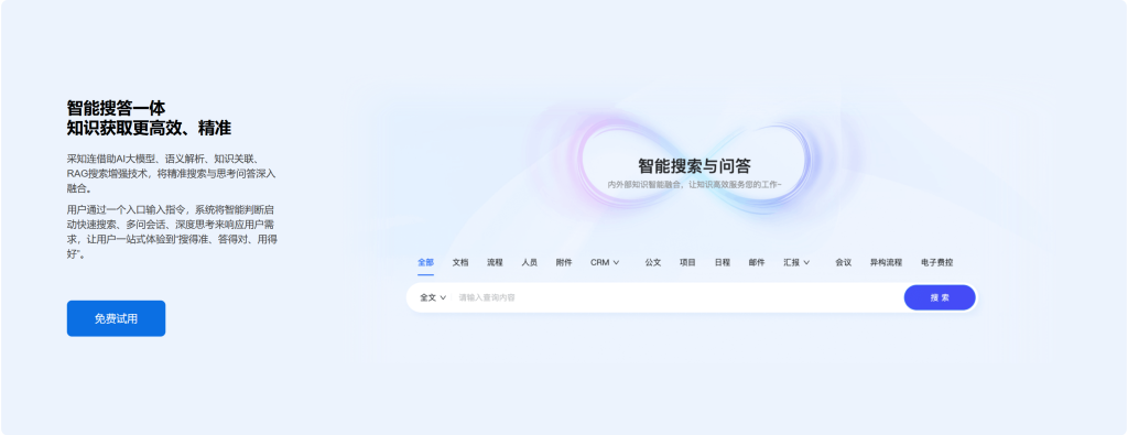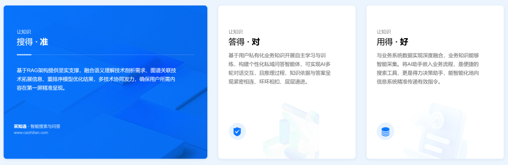 采知连借助AI大模型、语义解析、知识关联、RAG搜索增强技术,将精准搜索与思考问答深入融合