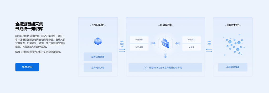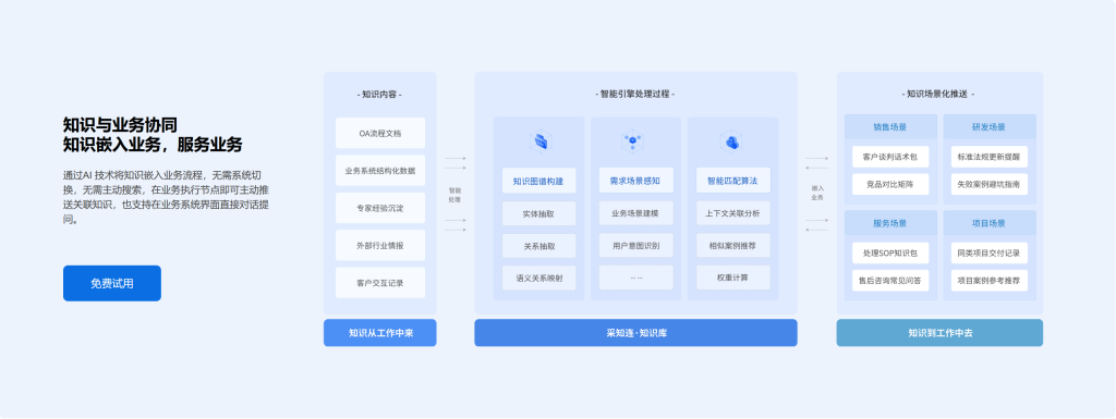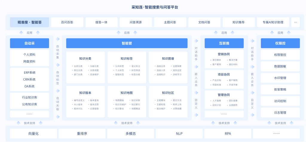 采知连通过多源知识自动采集、智能搜索与问答、知识业务深度融合、知识安全保障,让知识来源于业务、服务于业务