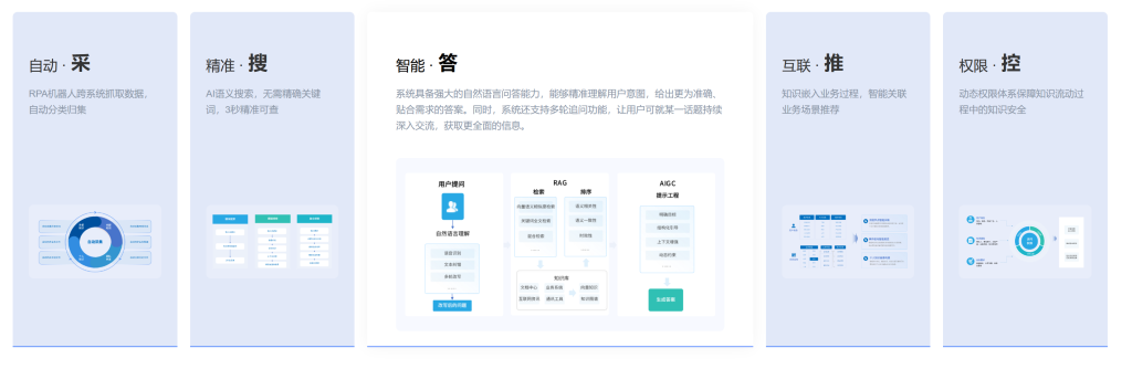采知连聚焦组织知识管理中“采、搜、答、推、控”五大核心需求,通过AI 技术助力实现精准搜答与知识安全的双重目标