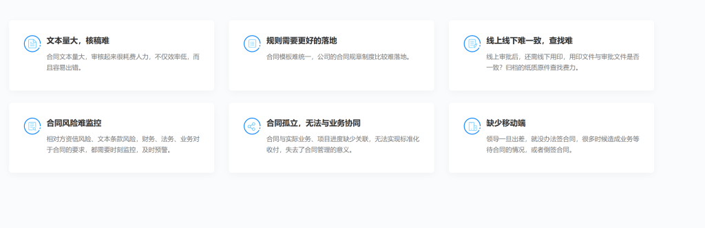 传统合同面临着文本量大、线上线下难一致、用时难查找、与业务脱节、风险难管控等问题