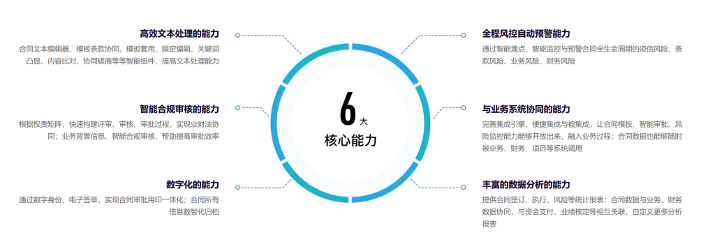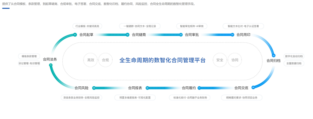提供了从合同模板、条款管理,到起草磋商、合规审批、电子签署、合同交底、数智化归档、履约协同、风险监控,合同全生命周期的数智化管理手段。