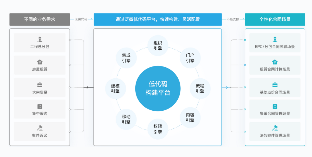 今承达合同管理平台的功能都是通过泛微低代码平台构建出来的,可以很方便的做调整与扩展; 不断支撑新的合同管理场景,赋予企业数智化应用构建的能力。