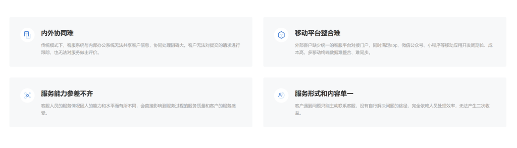 传统客服面临着内外协同难、平台整合难、服务能力参差不齐与内容单一等问题