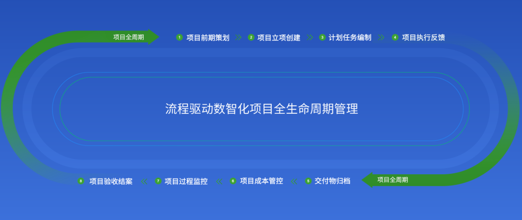 提供从项目前期策划、项目立项创建、计划任务编制、项目执行反馈、交付物归档、项目成本管控、项目过程监控、项目验收结案的
