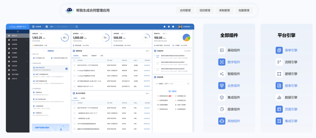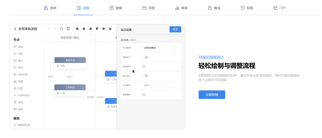 从表单、流程、业务建模、集成、页面、权限的全程搭建过程可视化,无需复杂操作,拖拉拽的方式即可搭建,即搭即用