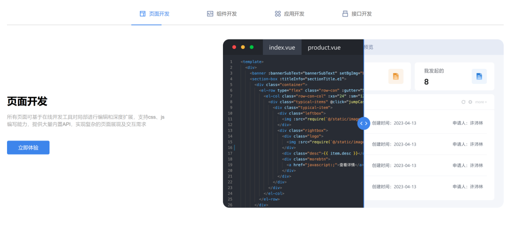 平台提供在线开发工具,从页面、组件,应用到各个API连接接口等,用户无需搭建开发环境,即可通过代码方式进行平台与应用的扩展,为每一个组织提供自主可控的数字化构建平台