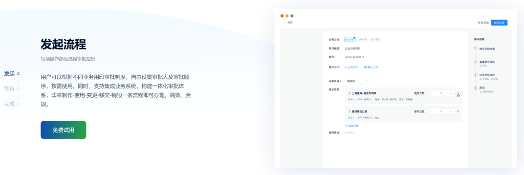 所有印章的制作、使用、移交、停用、销毁都可以通过流程审批来驱动;全面管控印章的使用、授权和变更。