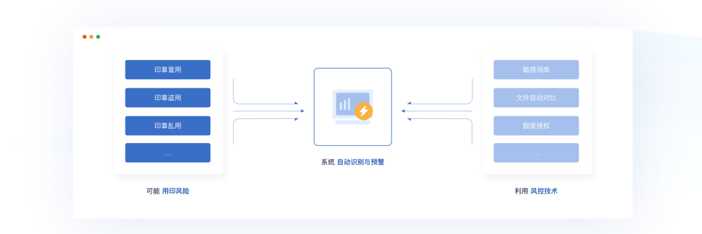 所有印章在使用过程中可能存在的冒用、盗用、乱用等风险,系统都能自动识别并及时预警 同时利用敏感词库、文件自动比对、额度授权等技术控制印章使用风险。