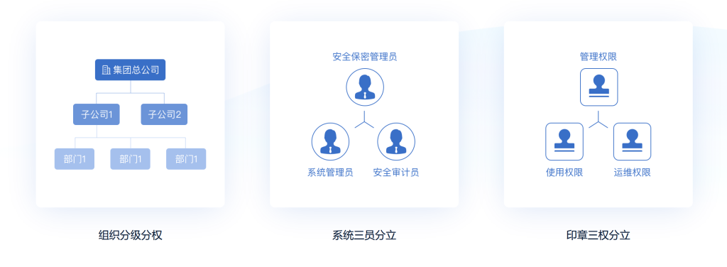 “组织”分级分权、“系统”三员分立,“印章”三权分立,满足集团印控需求,确保系统、印章安全。