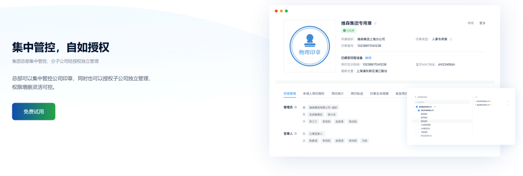 满足集团总部集中管控印章的需求,也能通过授权让分子公司独立管理自己的印章分级分权让集团对印章的管理收放自如。