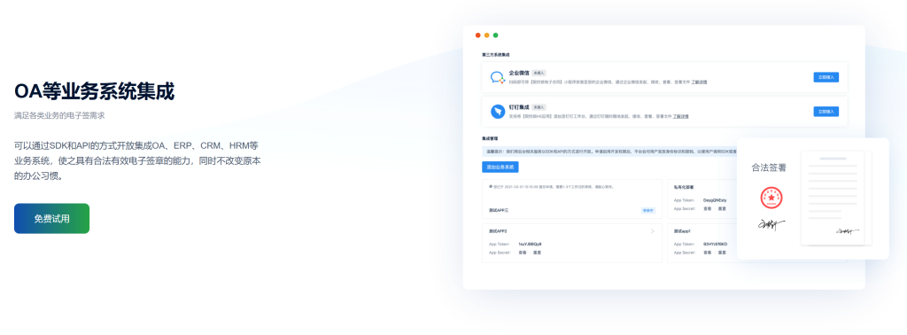 支持开放集成,让OA、ERP、HRM、CRM等业务系统具备合法有效的电子签能力。