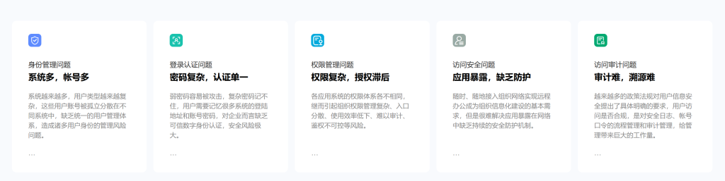 组织数字身份管理面临着:用户账号分散、认证方式单一、权限体系复杂混乱、访问控制风险大等问题