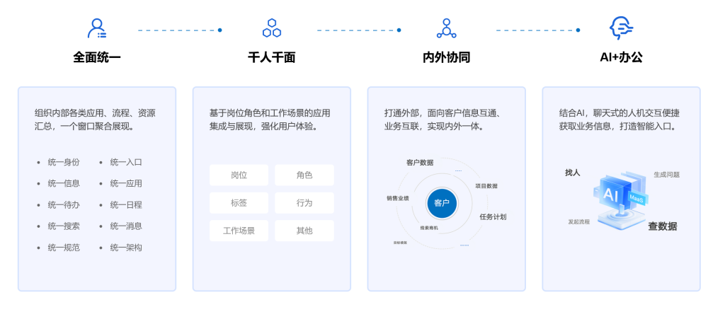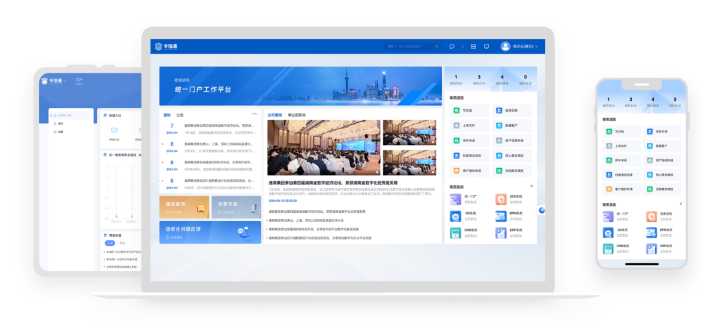 为内外部用户提供PC端和移动端统一门户入口,千人千面的个性化安全门户,应用、消息和数据集中展示
